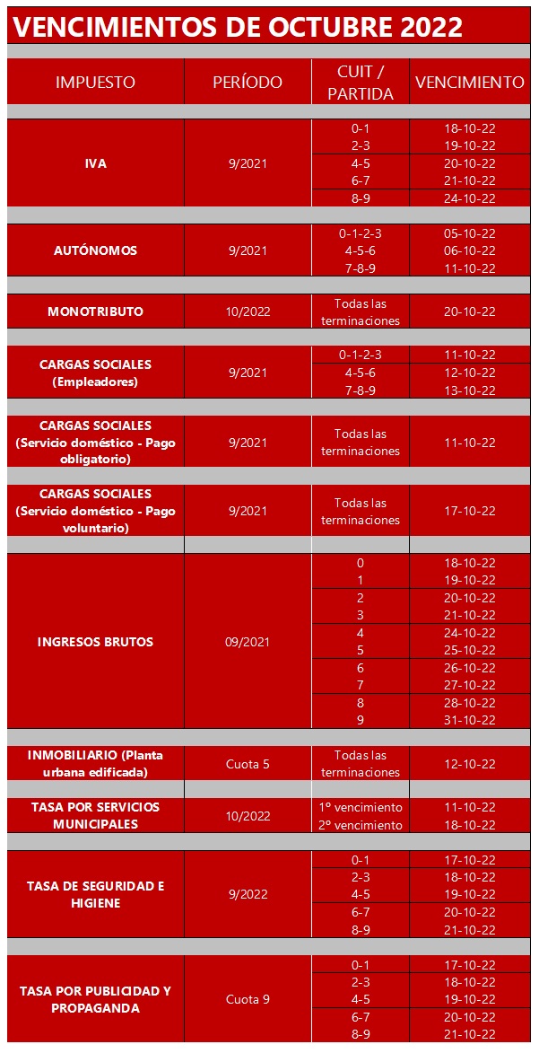 Vencimientos octubre 2022