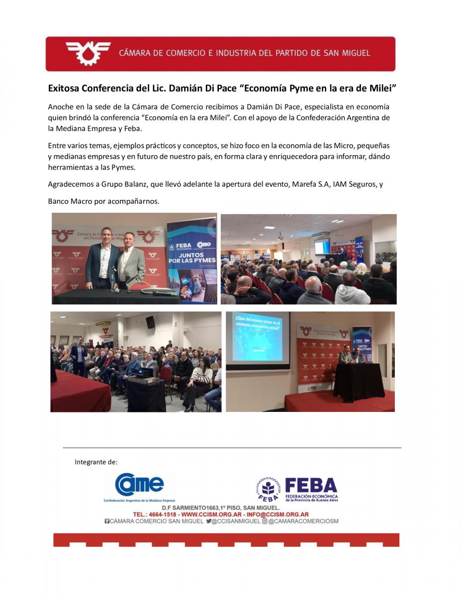 Anoche en la sede de la Cámara de Comercio recibimos a Damián Di Pace, especialista en economía quien brindó la conferencia “Economía en la era Milei”. Con el apoyo de la Confederación Argentina de la Mediana Empresa y Feba.